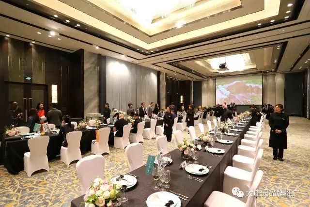 中午11點30分,宴會廳華燈初上、音樂響起,服務人員列隊兩旁等待前來的貴賓。精心布置的宴會大廳處處散發著優雅的氛圍,來自大洋彼岸的高端紅酒、澳洲紅肉已備好等待貴賓前來品鑒。
