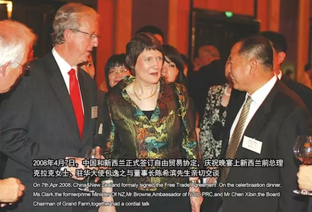 大莊園實業集團董事長陳希濱與新西蘭總理比爾·英格利希(右三)、現任新西蘭駐華大使約翰·麥康年(右一)、阿蘭茨CEO大衛·斯維爾(右四)合影